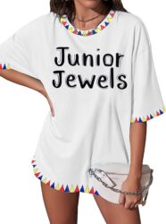 Next, add the Junior Jewels T-shirt, which is not always available online or in stores. The shirt is a white tee with black sharpie handwriting that reads “Junior Jewels.” To make it look like Taylor’s shirt, you can use the template that I made for you for free.